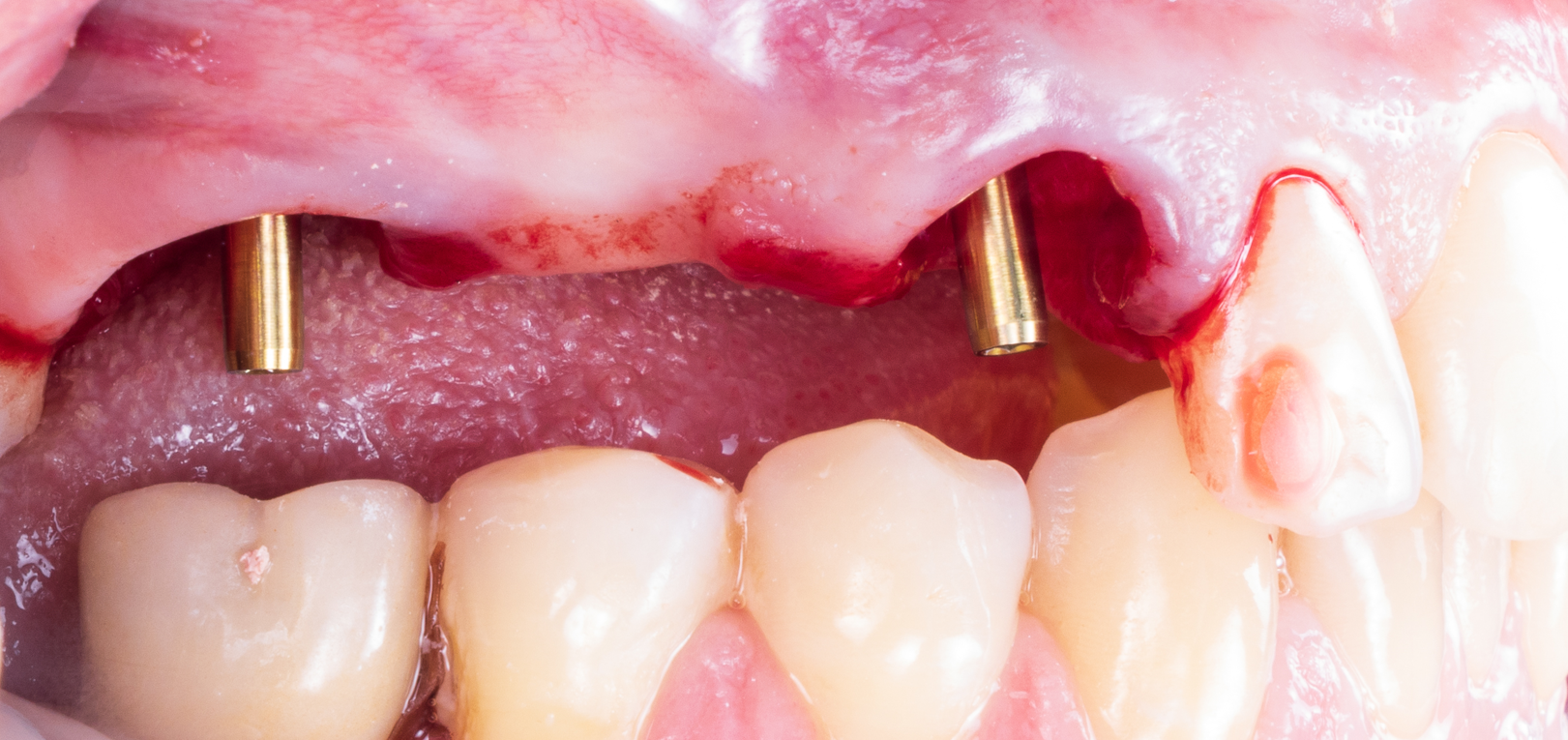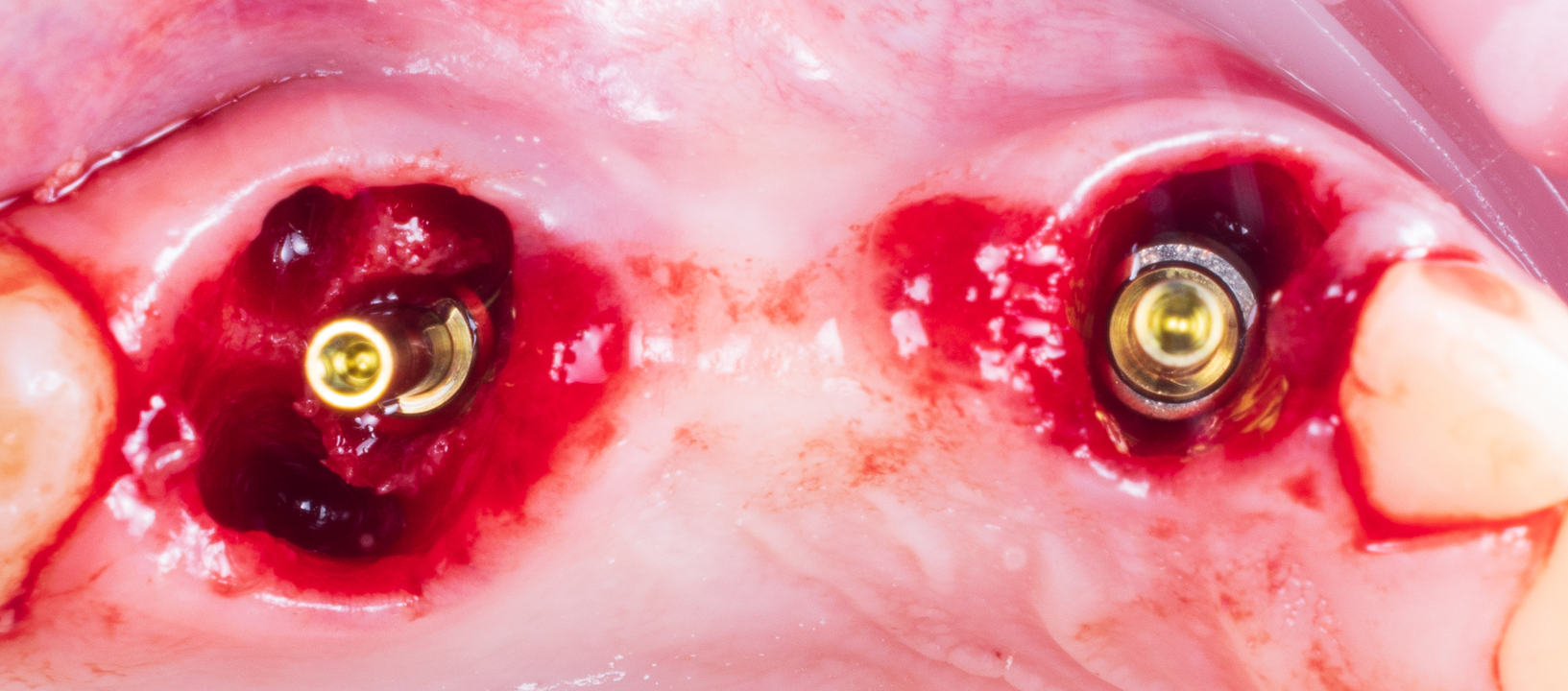 Рис. 1. Излишки костной ткани вокруг установленного имплантата Рис. 2-3. Основания для профилировщика, зафиксированные на имплантатах Рис. 4-5. Картина после удаления излишков костной ткани вокруг имплантатов с помощью профилировщиков костной ткани набора Bone Profiler Рис. 6-7. Установленные формирователи десны